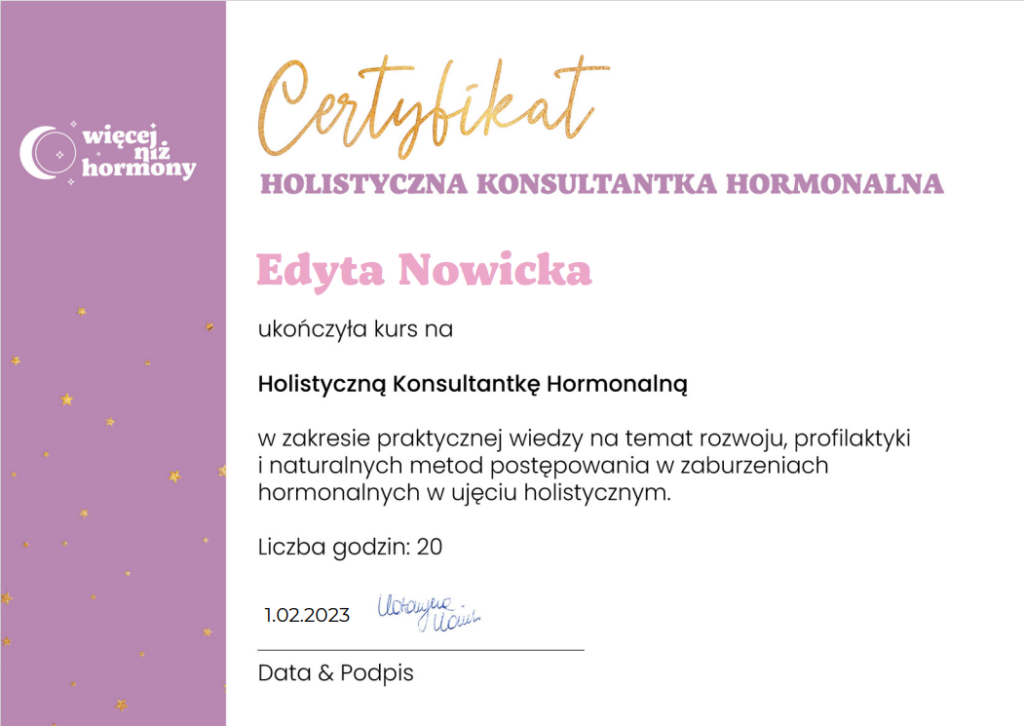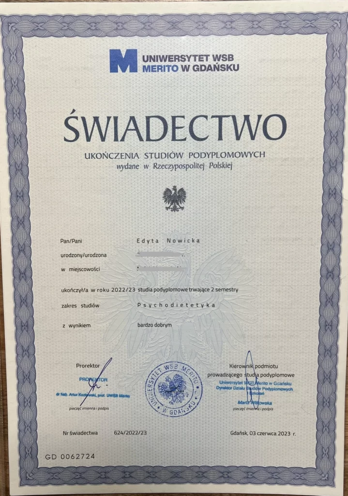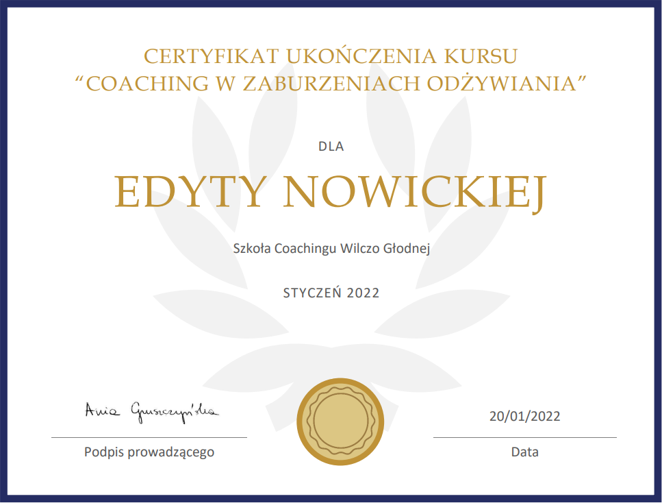 Moje holistyczne podejście do tematu zaburzeń odżywiania oraz odpowiednie narzędzia m.in. podyplomowe studia na kierunku PSYCHODIETETYKA, szkolenia, certyfikowane kursy: „Coaching w zaburzeniach odżywiania” oraz „Holistyczna Ekspertka Hormonalna” u Katarzyny Kużuch z „więcejniżhormony”, a także ciągłe i samodzielne zgłębianie wiedzy i doszkalanie się z zakresu zdrowego stylu życia i zaburzonej relacji z jedzeniem oraz psychologii zapewnią Ci szybki powrót do zdrowia, jedzenia w lekkości i w konsekwencji do wymarzonej wagi.