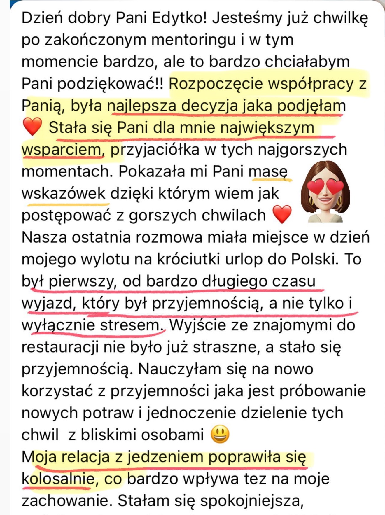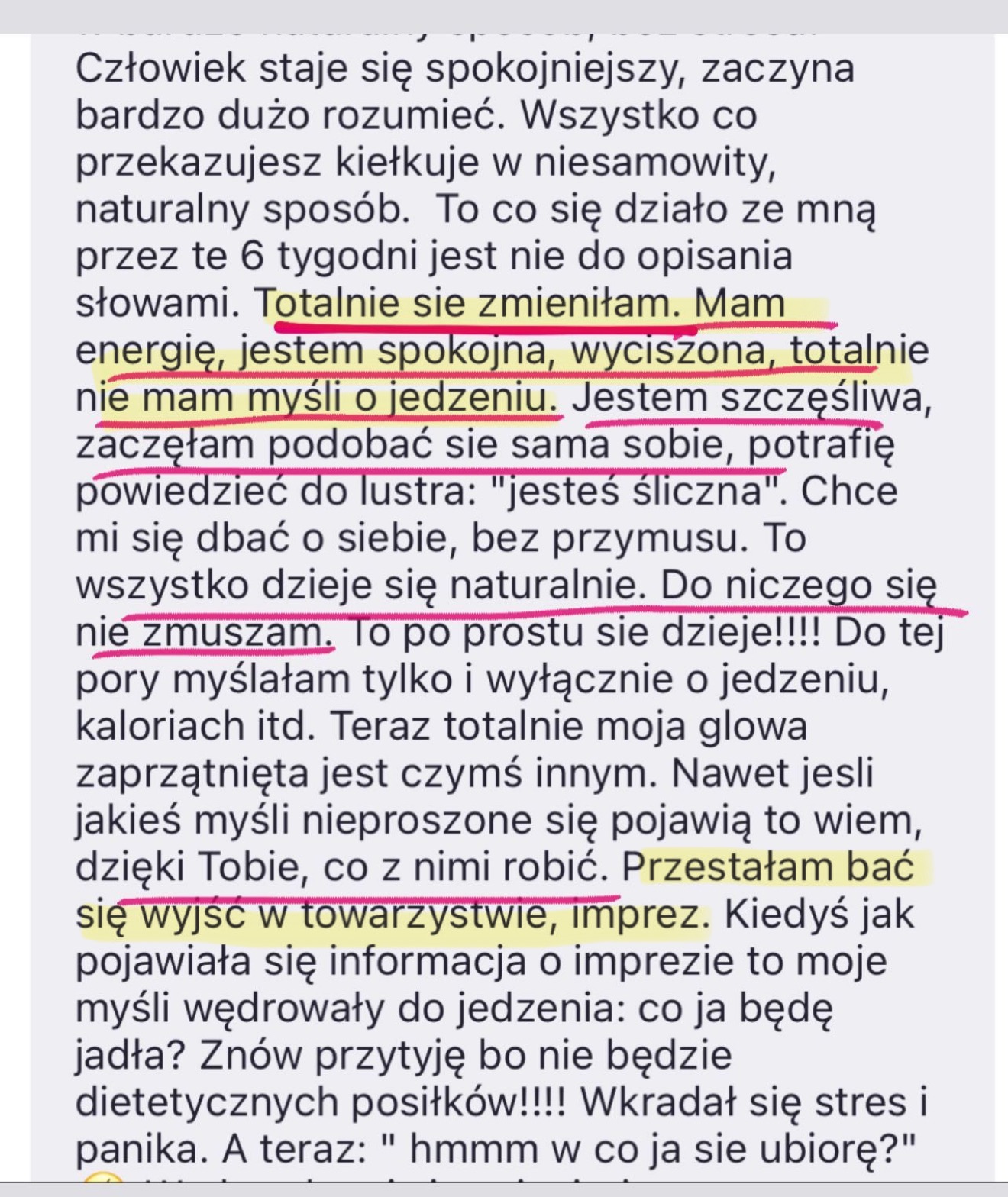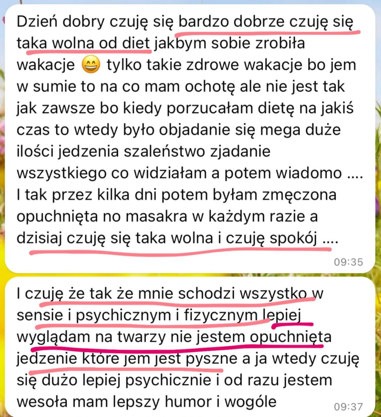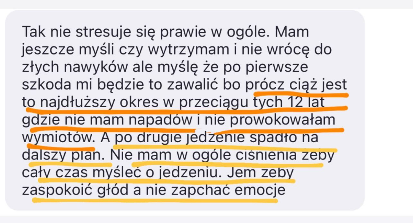Zobacz, co mówią kobiety, które jeszcze niedawno były dokładnie w tym samym miejscu co Ty. Zmęczone, zagubione i pełne lęku przed jedzeniem. Każda z tych kobiet kiedyś myślała, że już nic jej nie pomoże. A potem zrobiła pierwszy krok – i dziś mówi o spokoju, jakiego nie czuła od lat.