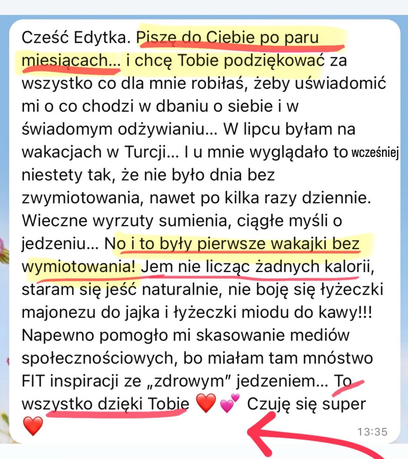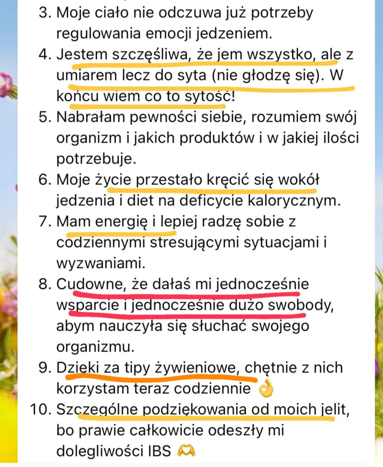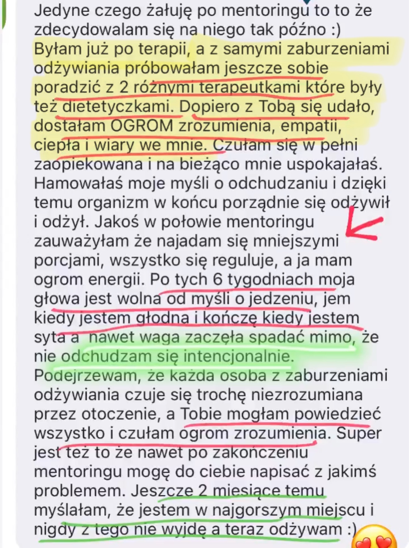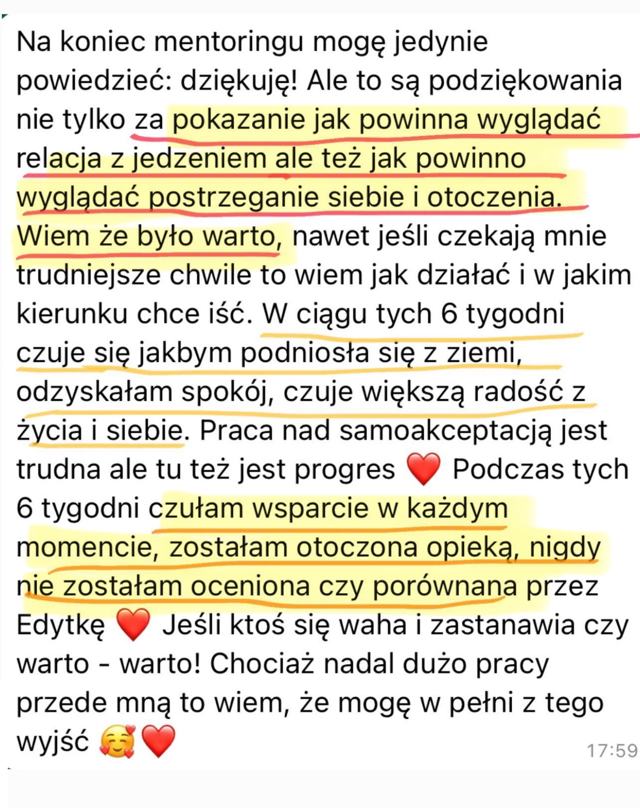 Zobacz, co mówią kobiety, które jeszcze niedawno były dokładnie w tym samym miejscu co Ty. Zmęczone, zagubione i pełne lęku przed jedzeniem. Każda z tych kobiet kiedyś myślała, że już nic jej nie pomoże. A potem zrobiła pierwszy krok – i dziś mówi o spokoju, jakiego nie czuła od lat.