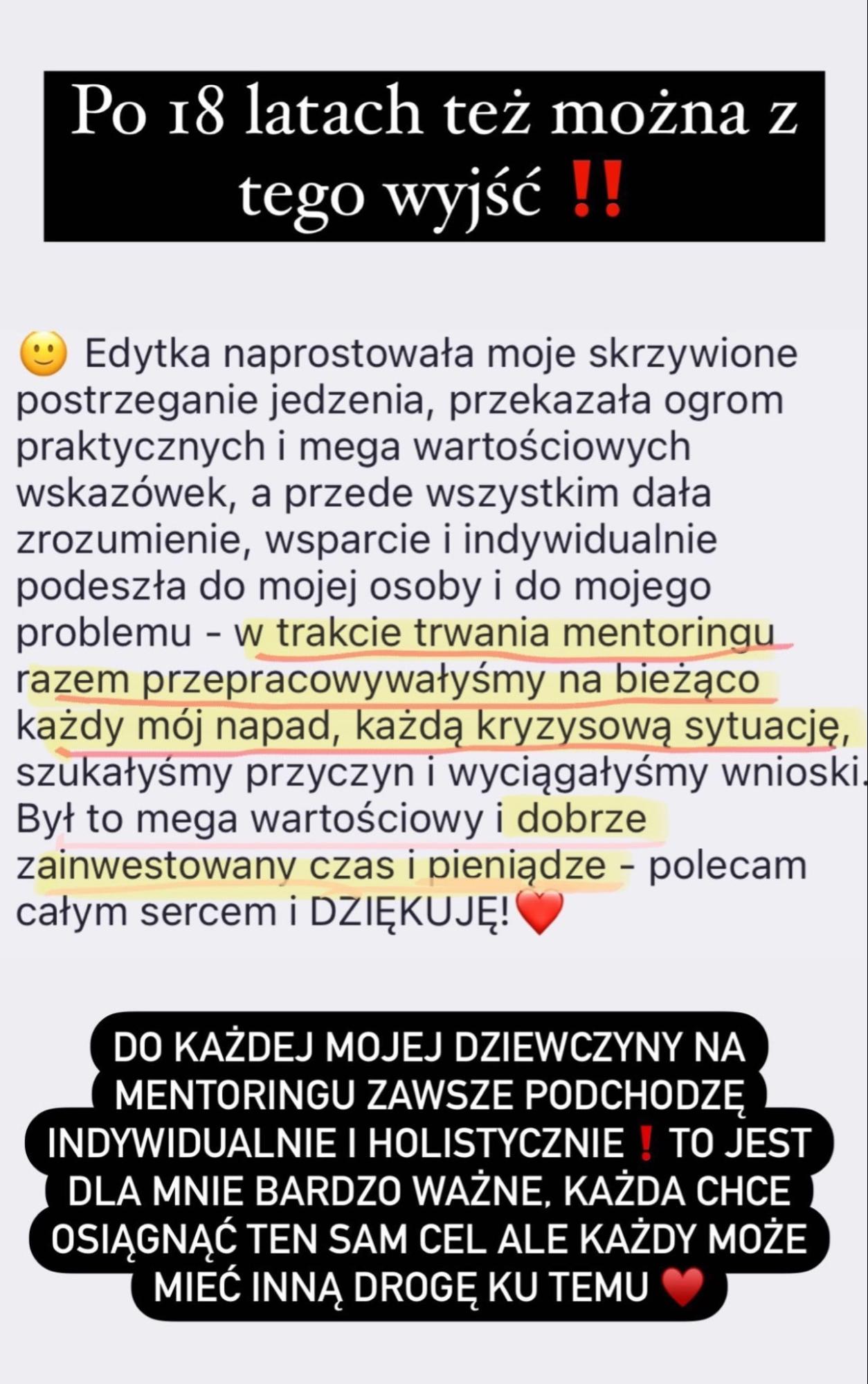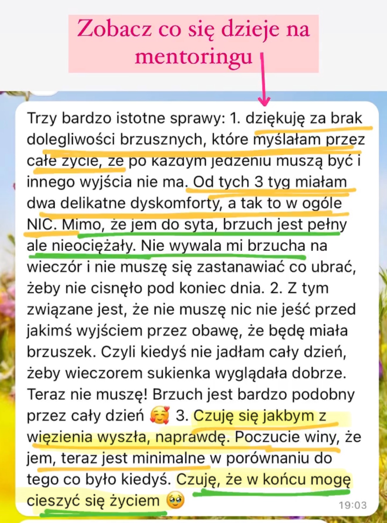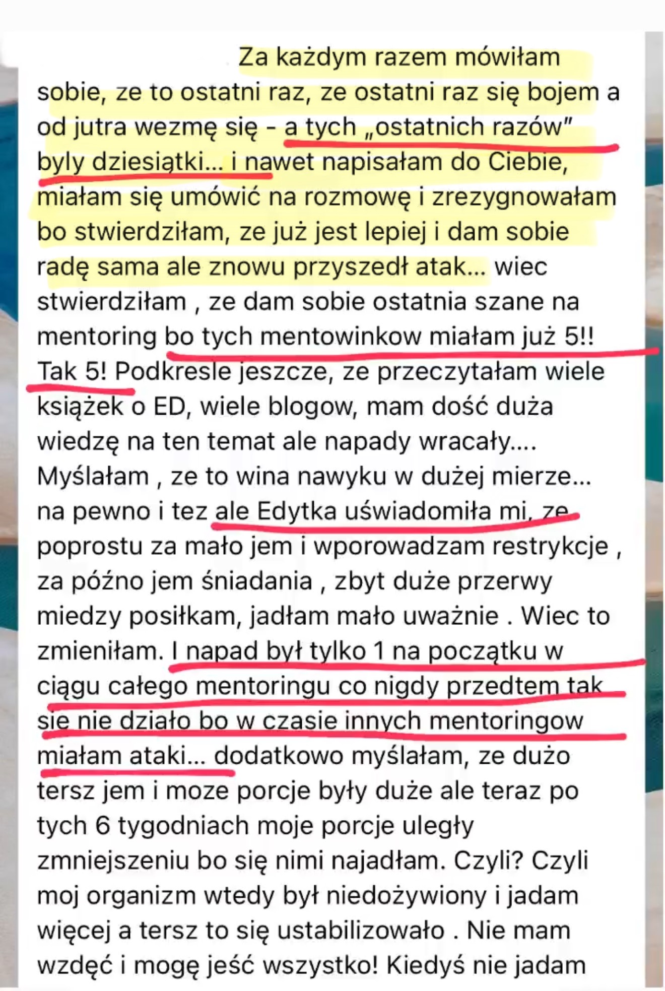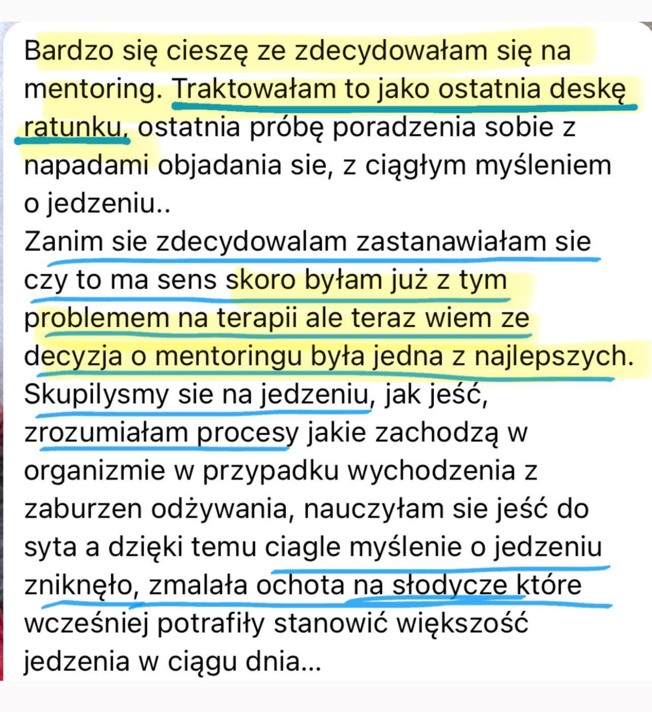 Mentoring „WOLNA OD NAPADÓW” to nie teoria, tylko realny proces, który pomógł już setkom kobiet odzyskać kontrolę i wolność jedzeniową. Ponad 300 kobiet przeszło przez ten wspierający program. Każda z własną historią, bólem i punktem wyjścia.